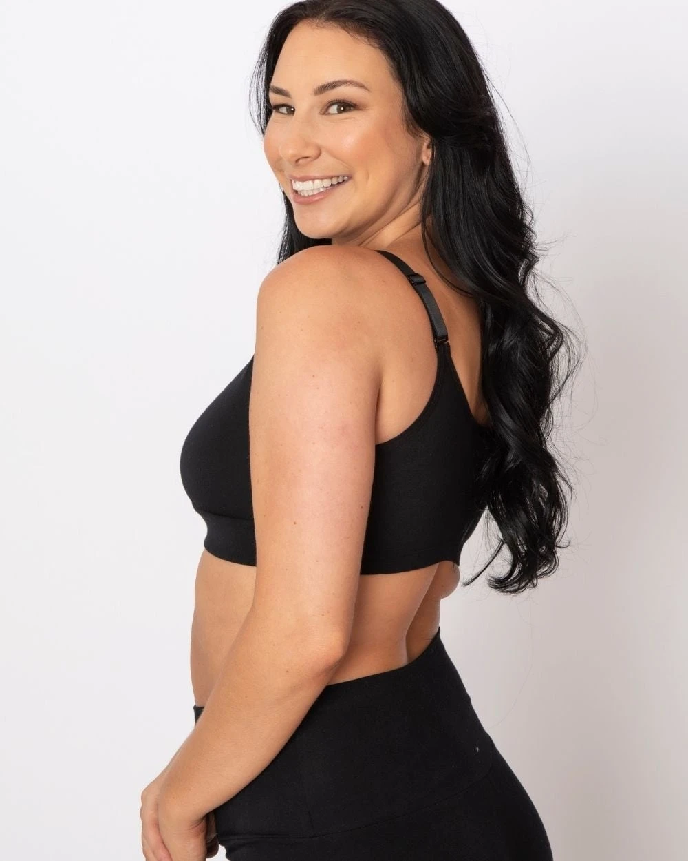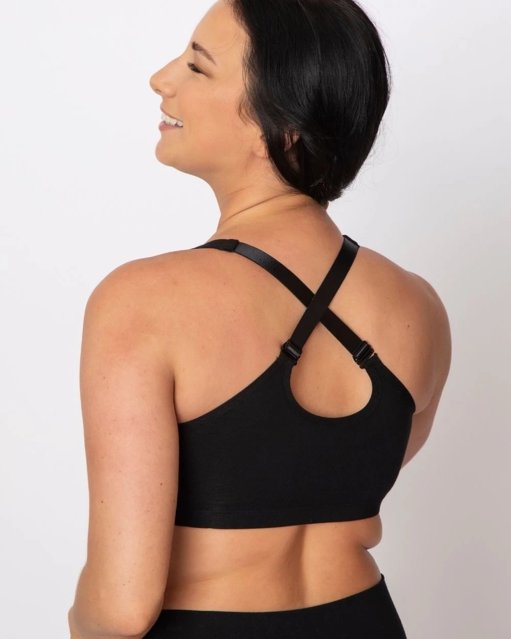 Super soft front close bra with pocketed cups makes dressing easy, great for breast surgery recovery.