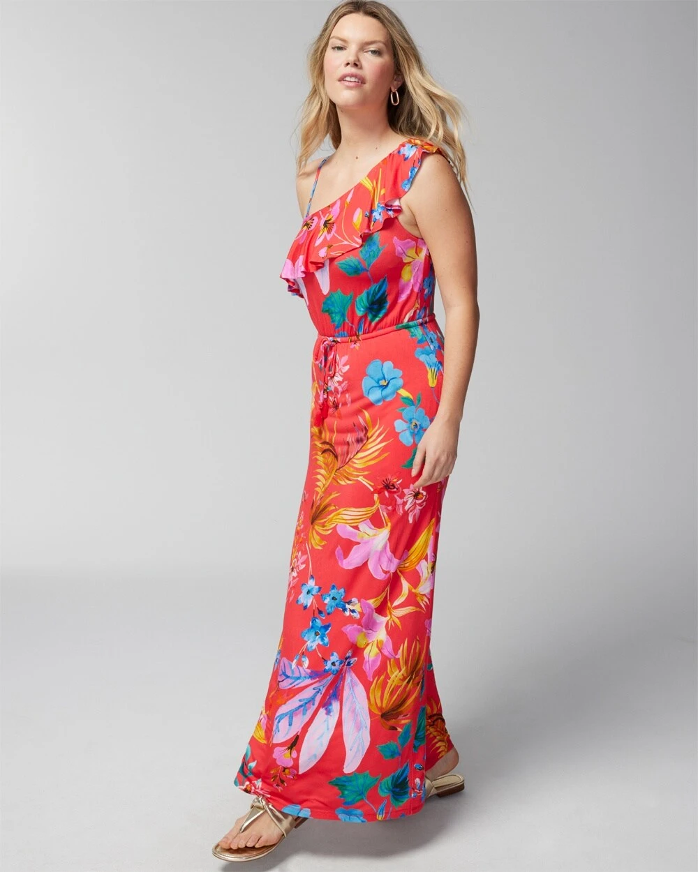 - One-shoulder ruffle neckline