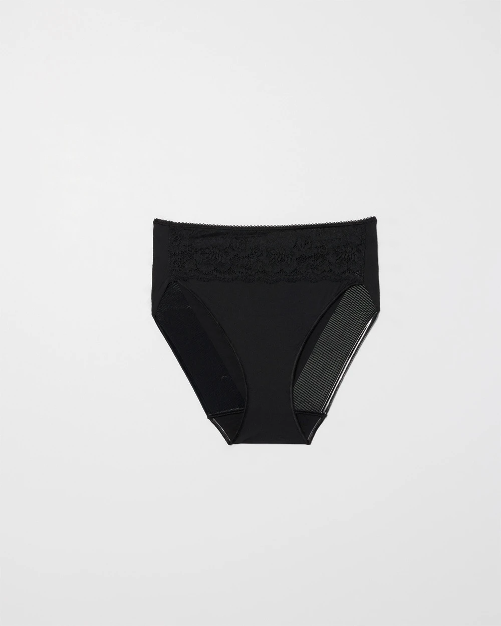 - Soft, sheer stretch lace at front waistband, picot elastic at back.